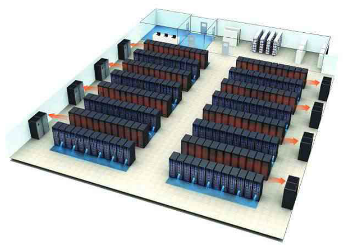 ? ?2、環境控制系統,通常選用機房精密空調對數據中心的環境調節,確保服務器等IT設備的運行環境。對于發熱量大的服務器等IT設備,通常選用高通孔率(一般大于70%)網孔門的機柜,提高機柜進出風量;將機柜面對面、背對背布置,在機房內形成冷熱隔離的風道,提高制冷效率:空調采用下送風方式,確保機房送風均勻,提高制冷效率。